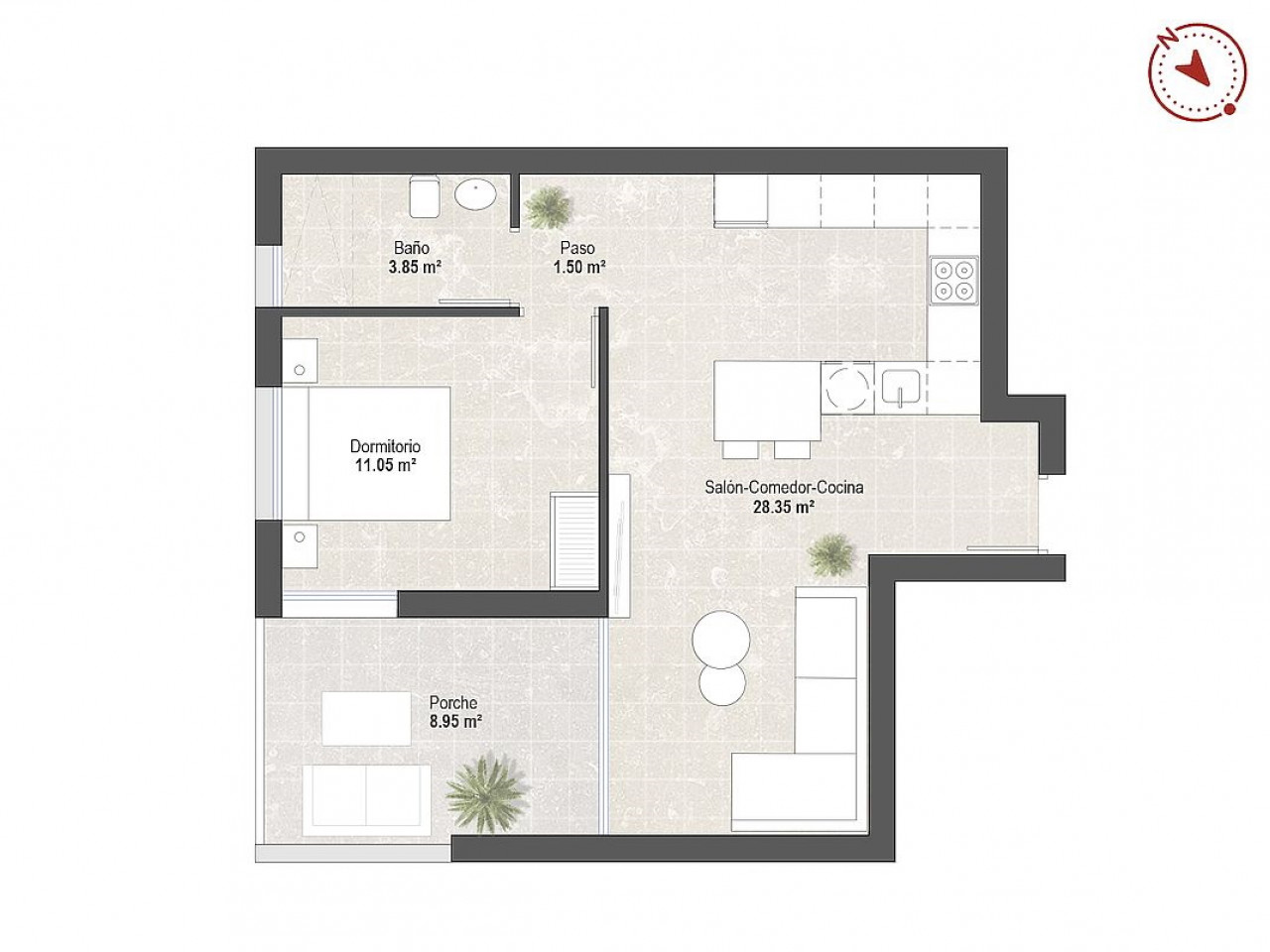The project offers apartments with either 1 bedroom and 1 bathroom or 2 bedrooms and 2 bathrooms, one of them en suite. Each property features a private terrace of approximately 9 m2 and a bright open plan layout where the fully furnished kitchen with appliances connects seamlessly to the living area.