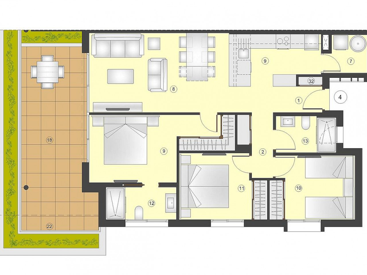 The ground floor apartments and maisonettes will have a garden whilst those on the top floor will have a solarium. All homes will benefit from natural light and spacious rooms. The villas also have large gardens with the option of a private pool. All homes will have external and/or basement parking and a storage room, depending on the type of home.