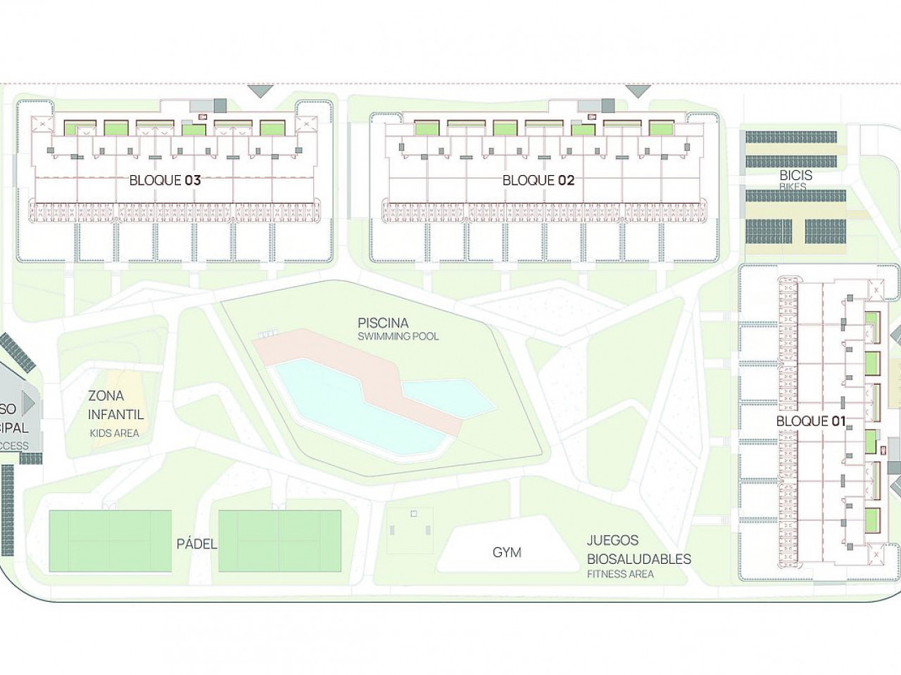 The complex features low rise buildings arranged around an impressive communal area. Residents will enjoy outstanding shared amenities including adult and children swimming pools, landscaped gardens, a children playground, indoor and outdoor gyms, paddle courts, bike parking and a complete spa area with sauna.