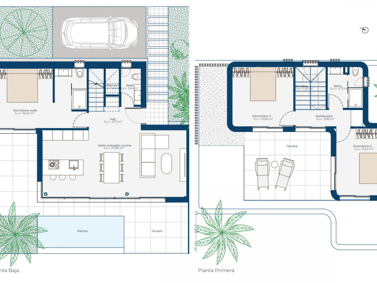 The terraced villas are arranged across two floors and offer a more independent residential experience. On the ground floor, floor-to-ceiling windows in the living area open fully onto a pergola-covered terrace, leading to the garden and swimming pool. This level also includes an en-suite bedroom and a guest toilet. The remaining bedrooms are located on the first floor, sharing a bathroom and accessing a terrace overlooking the pool and garden area. Each villa includes parking on the plot, combining comfort with everyday practicality.