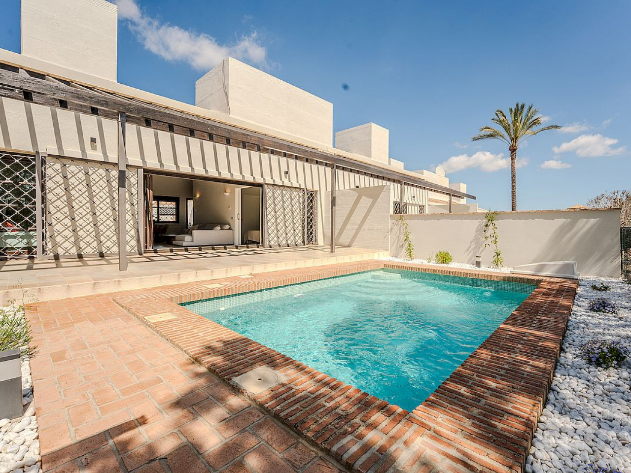 A dwelling full of exclusive details such as the pond at the entrance and a porch covered by a treated wood pergola.
