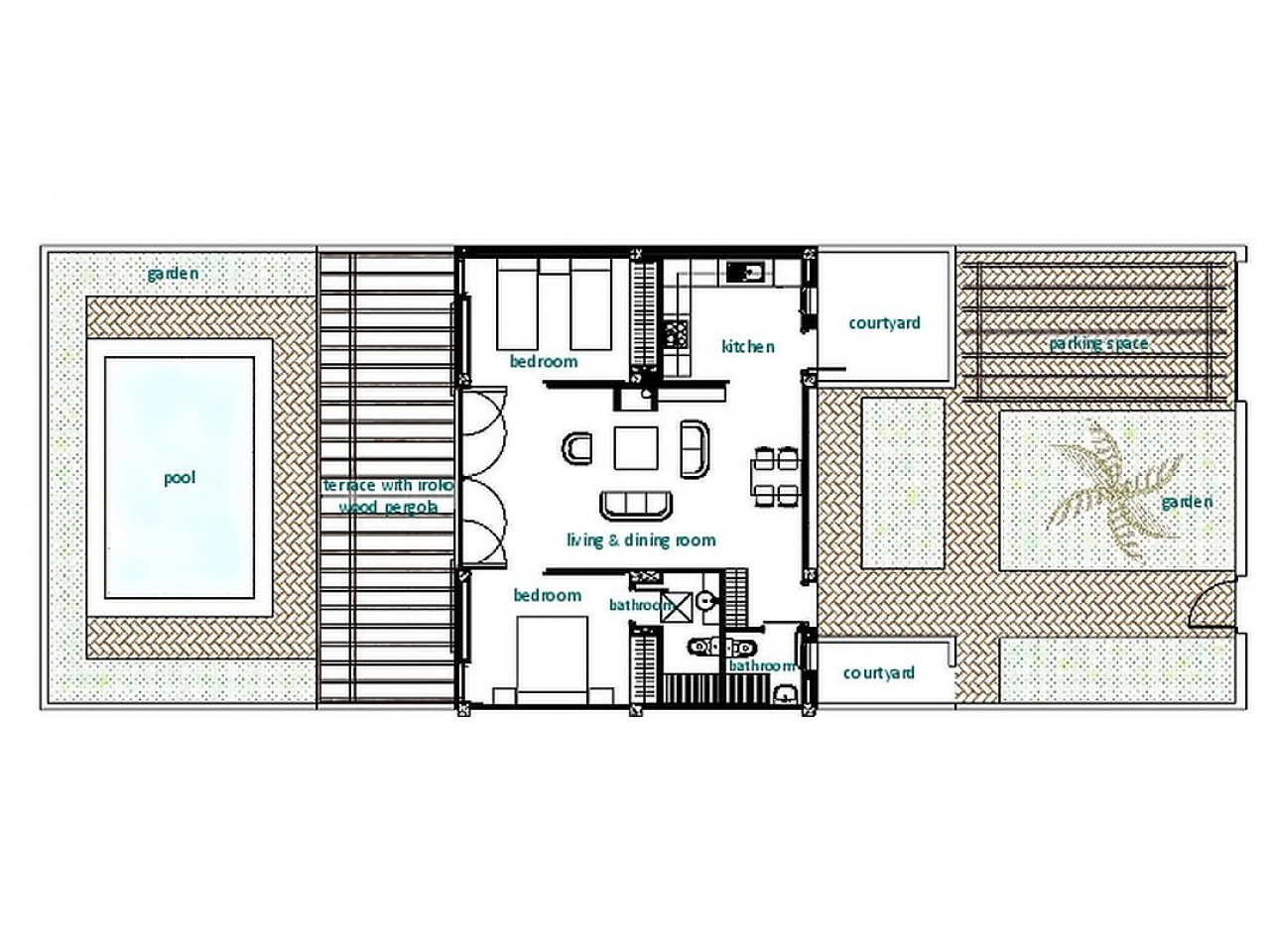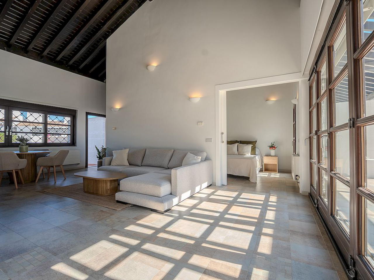 Comprising two bedrooms, two bathrooms, a kitchen with laundry area and an extensive dining room/lounge with two enormous French windows which provide the dwelling with extraordinary luminosity, underneath the impressive wooden beam roof.