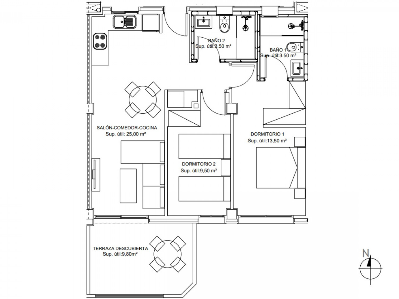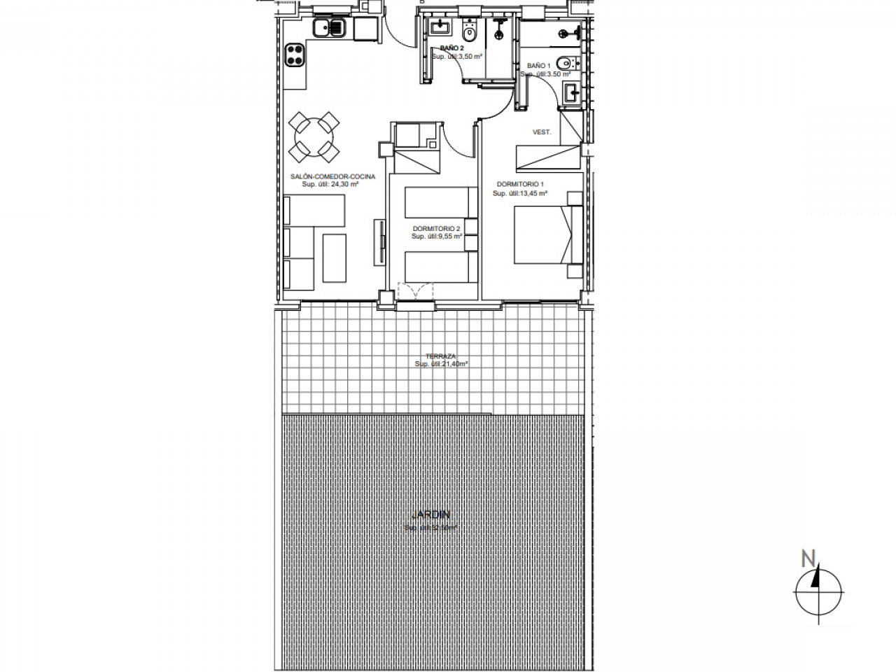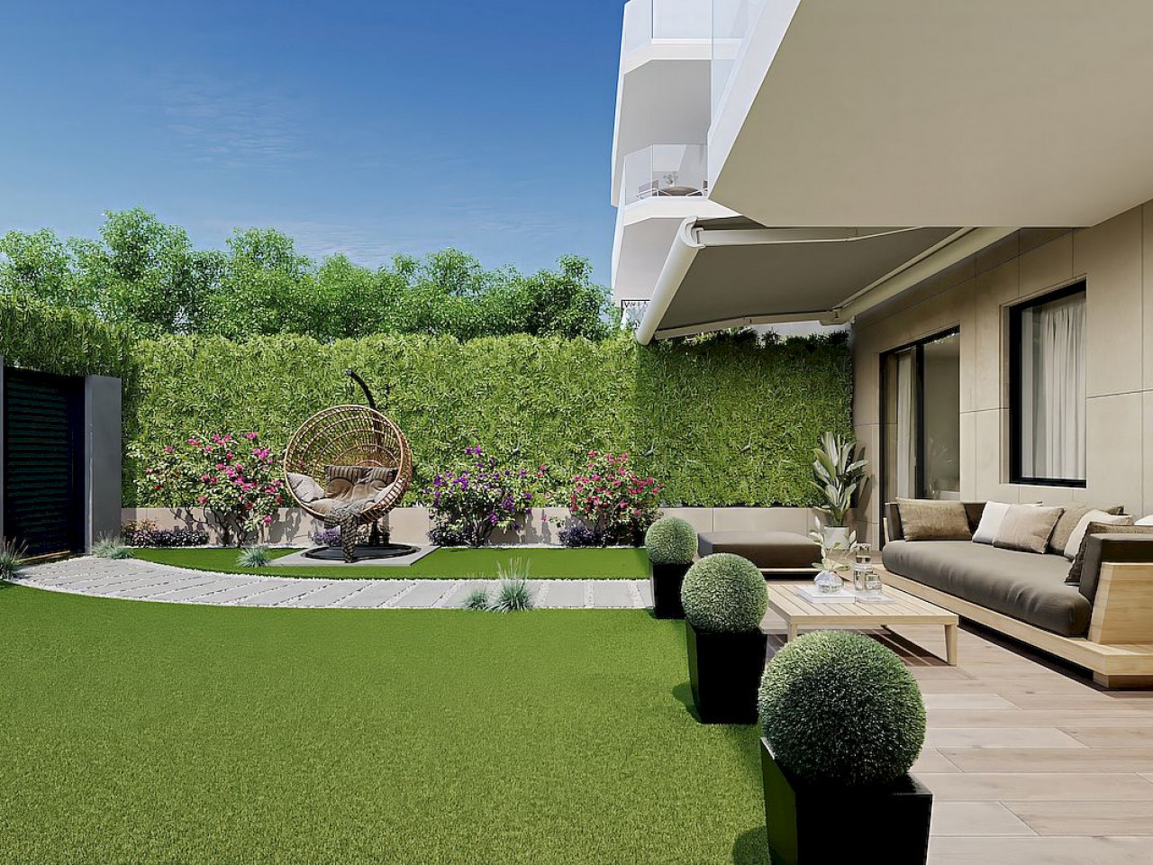The apartments feature one, two or three spacious bedrooms and one or two bathrooms with large terraces. The living area is bright and open-plan, with large windows creating a seamless connection to the terrace. The open kitchen is fully equipped with high-end Bosch or Siemens appliances and finished with premium Porcelanosa materials. Every detail reflects durability and refinement