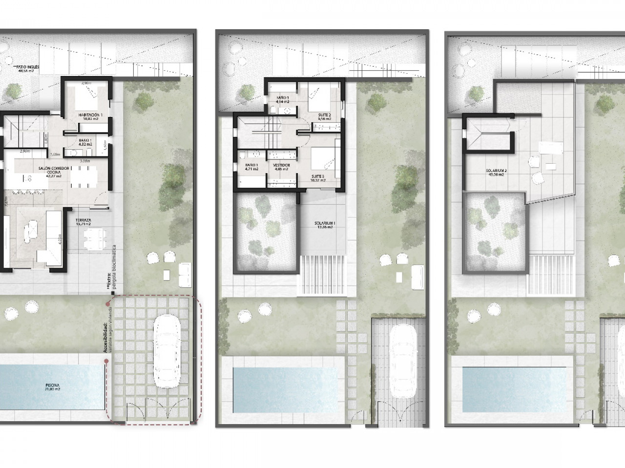 On the first floor you get to a magical space with one bedroom with a suite and a walk-in closet and an ample terrace, one bedroom with en-suite bathroom, a panoramic window and an all-day-sun solarium.