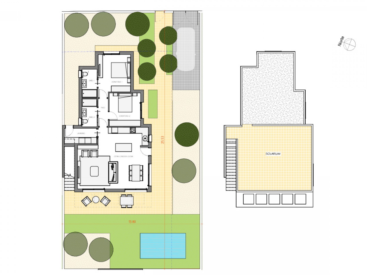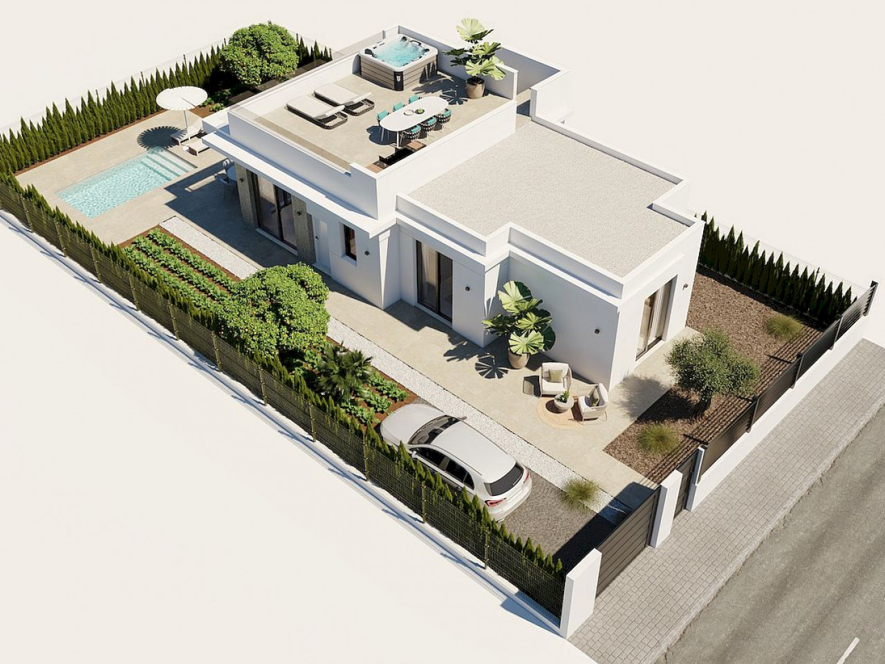The residential complex consists of 17 one level villas on plots starting at 300 m². All properties have 2 or 3 bedrooms and 2 full bathrooms on one floor, as well as a terrace area with a private pool and a private solarium on the roof with mountain open views and sun all day.
