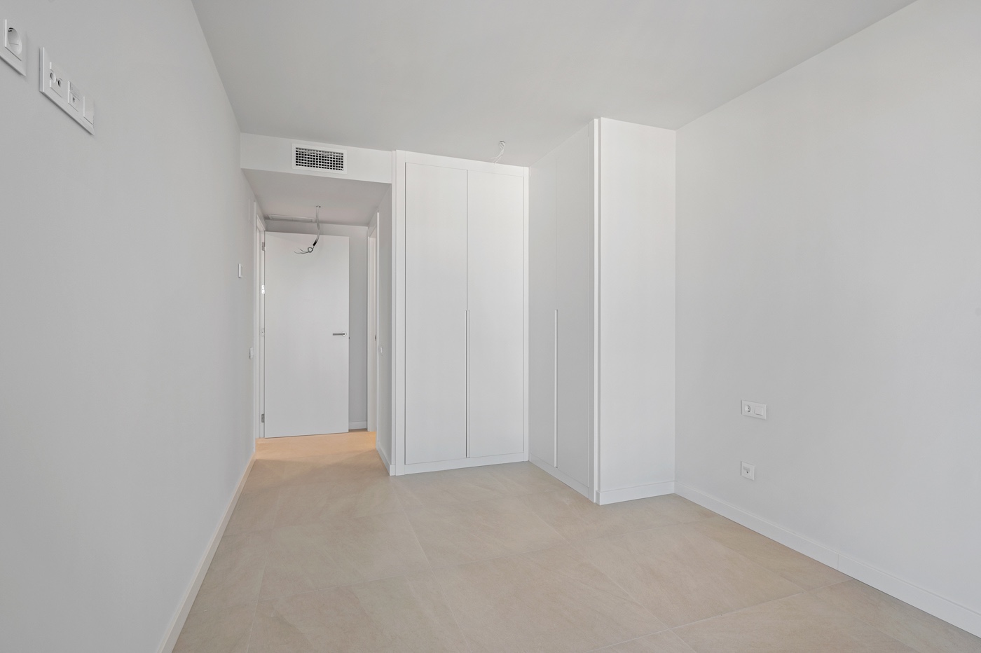 The apartment is finished but unfurnished. The kitchen is equipped with Siemens appliances: oven, microwave, and induction hob. A refrigerator and dishwasher need to be purchased separately. The bedrooms feature built-in wardrobes. There is also a dedicated laundry space and a utility/storage cupboard in the hallway.