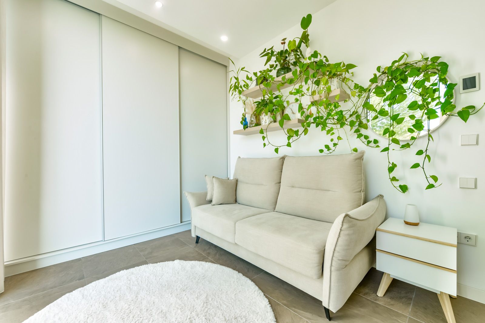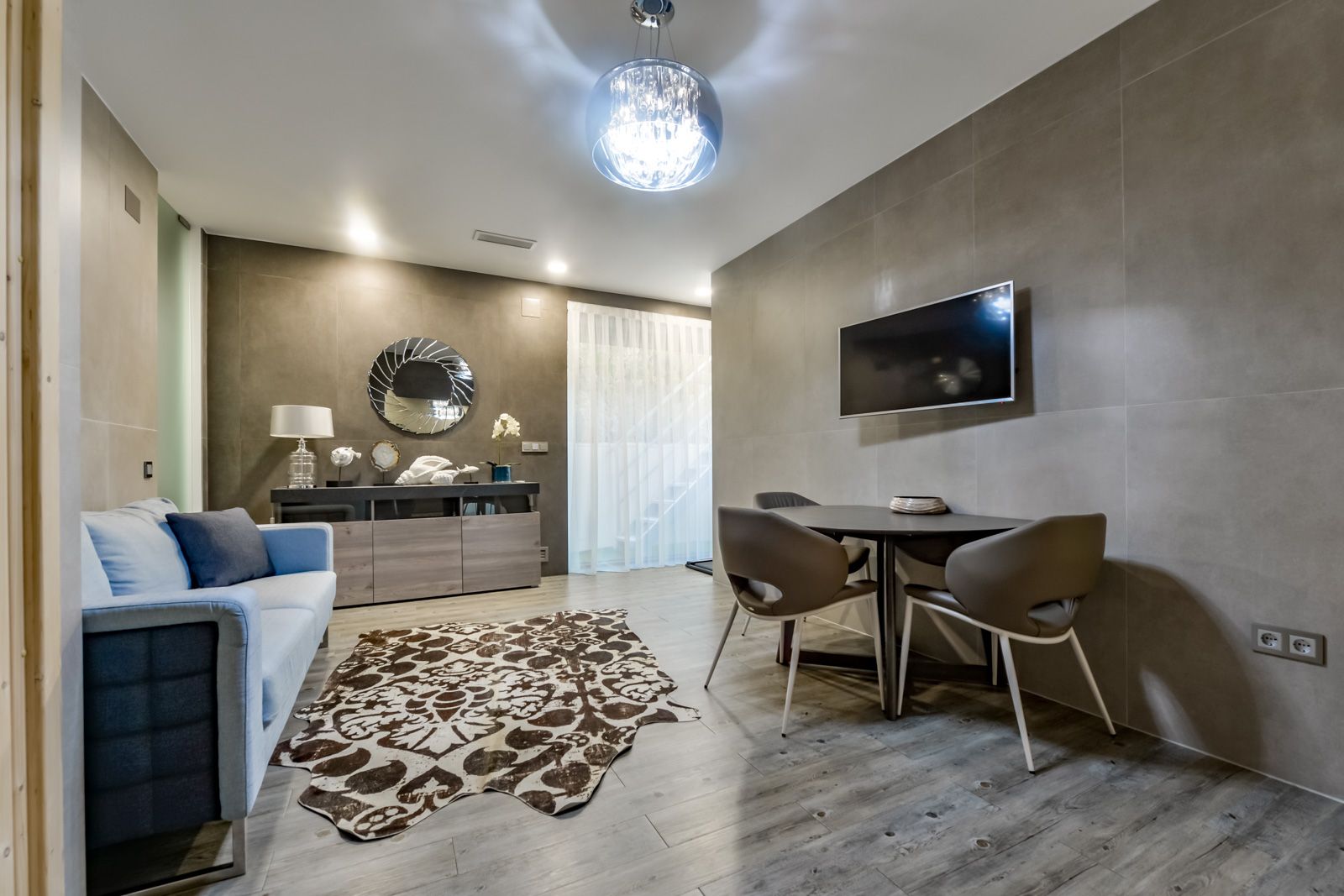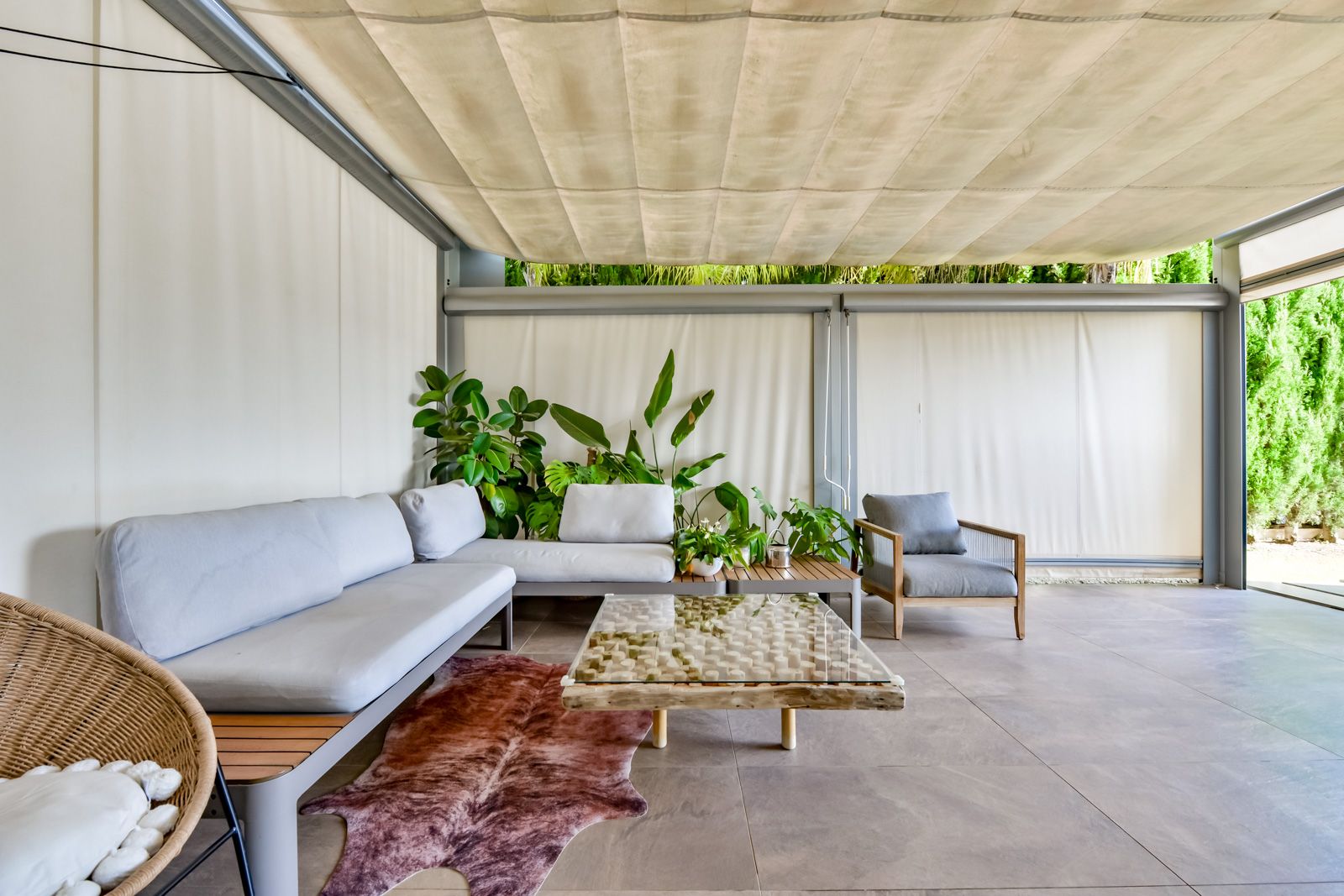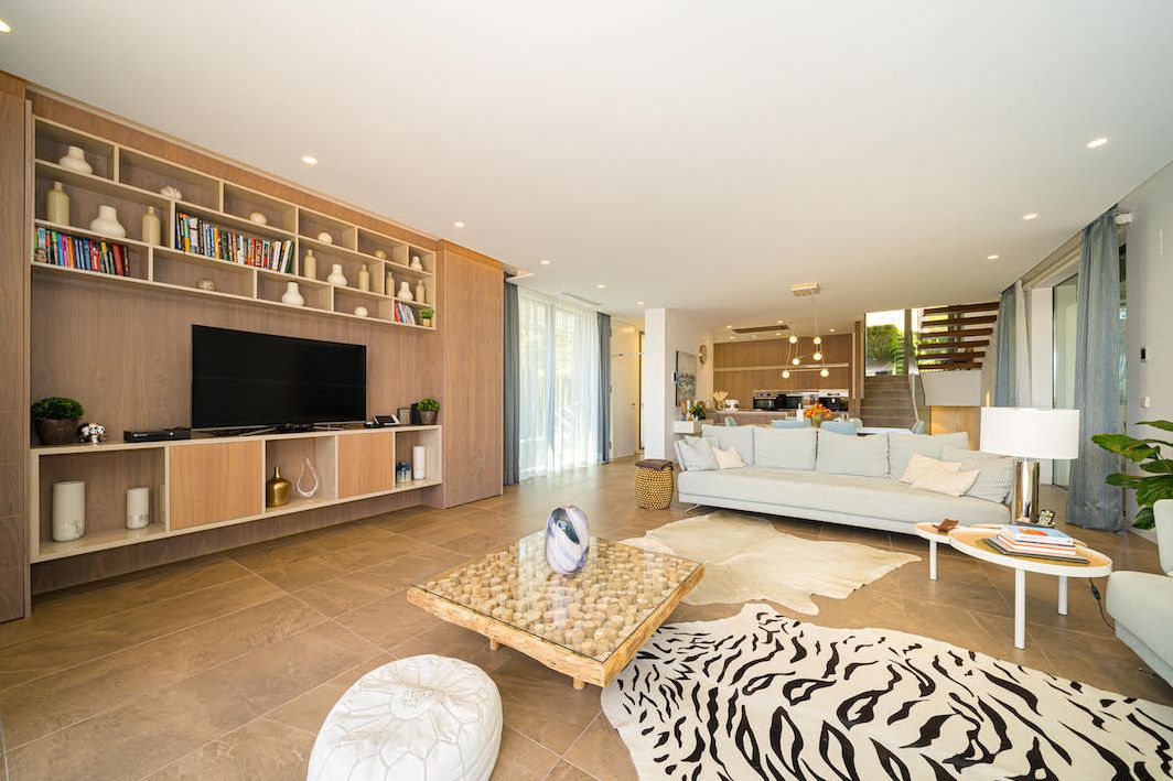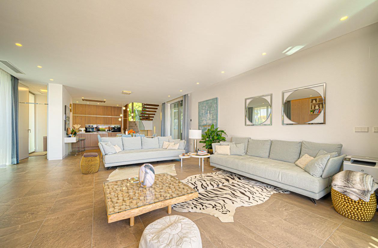 The spacious living room opens up to the garden, creating a harmonious transition to the outside. The property features a private saltwater pool, a healthier and more enjoyable option for the skin, which also requires less maintenance and provides a more natural and comfortable bathing experience.