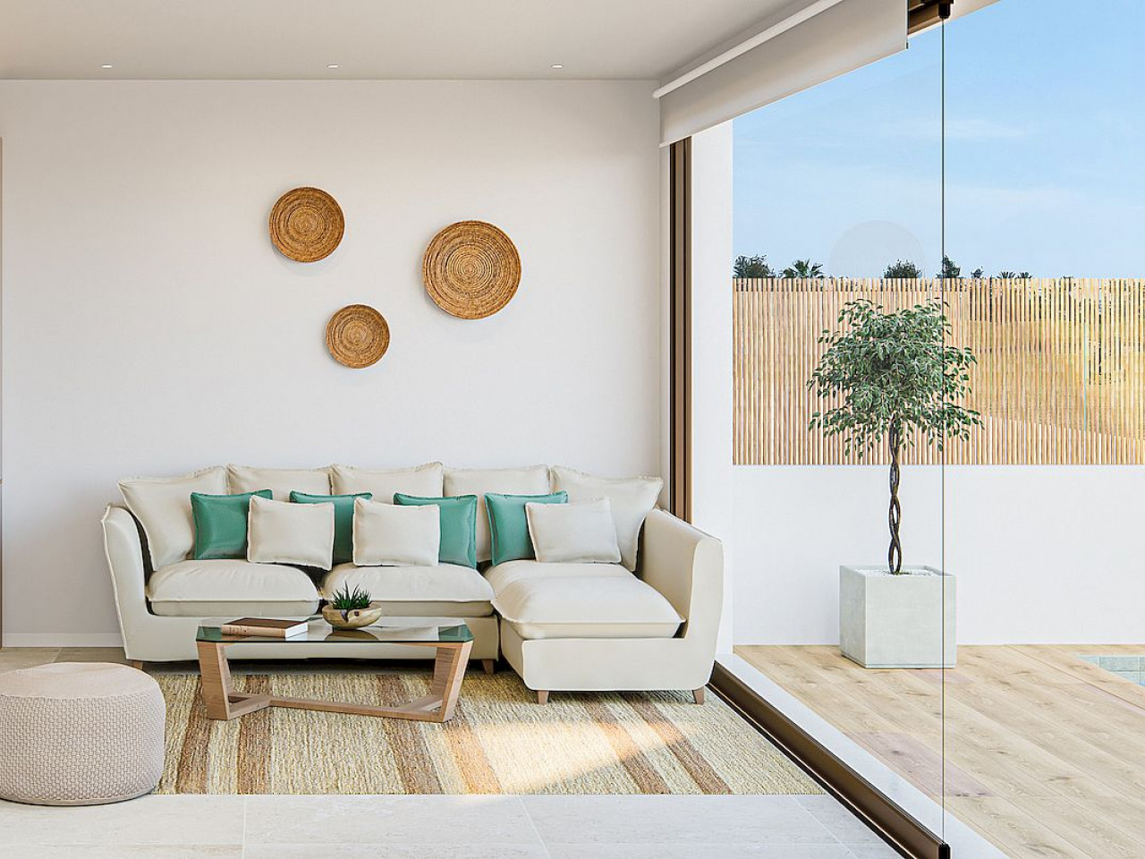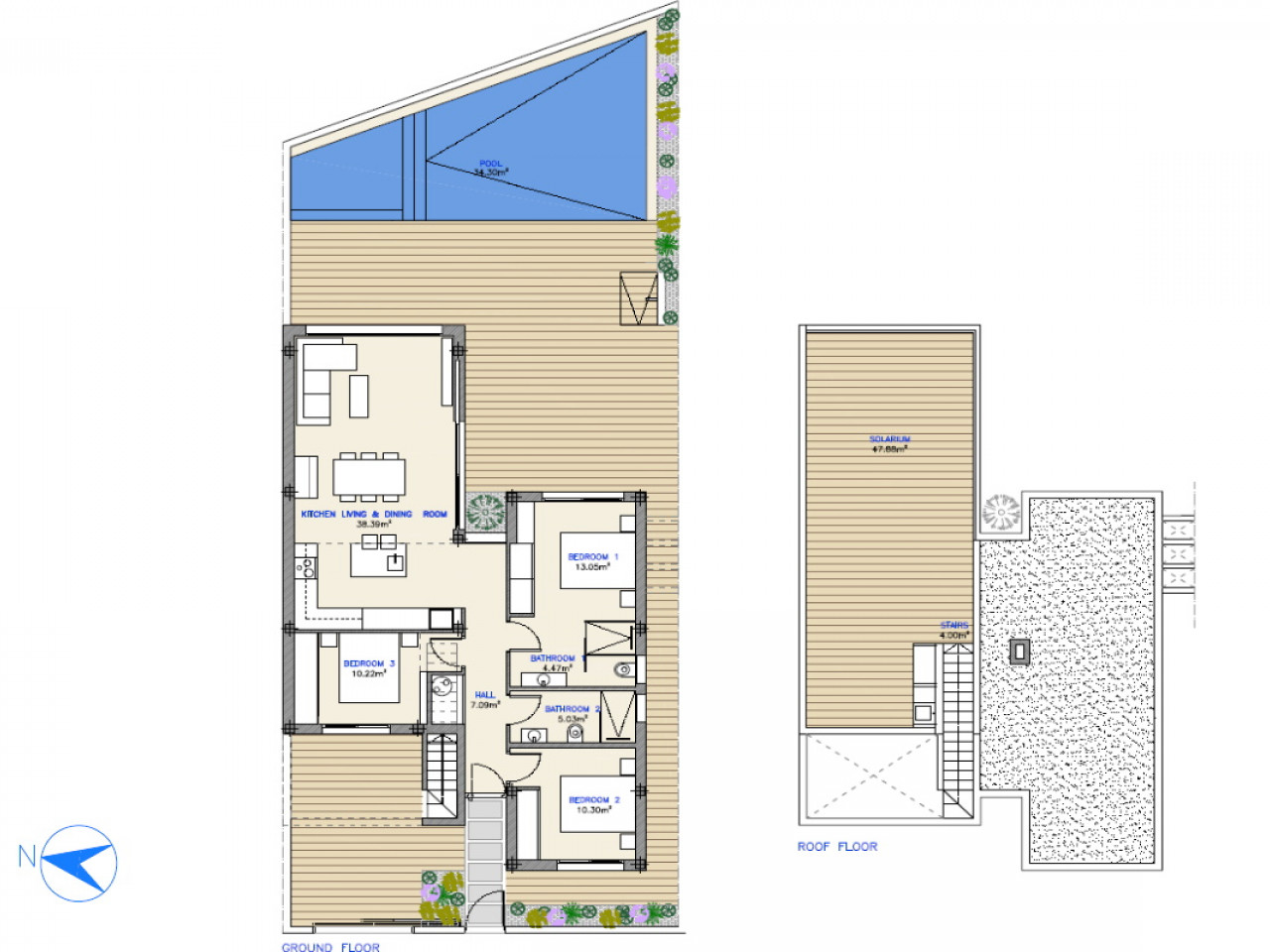 Kiekvienoje vieno aukšto viloje yra 104 m² apgalvotai suplanuota gyvenamoji erdvė su 3 miegamaisiais ir 2 vonios kambariais, kurie siūlo komfortą ir stilių. Mėgaukitės nuosavu baseinu, puikiai tinkančiu poilsiui ar pramogoms, ir privačia automobilių stovėjimo vieta. Didelės terasos su pasirenkama 48 m² stogo terasa suteikia papildomos gyvenamosios erdvės lauke, kur galėsite mėgautis nuostabiais vaizdais.